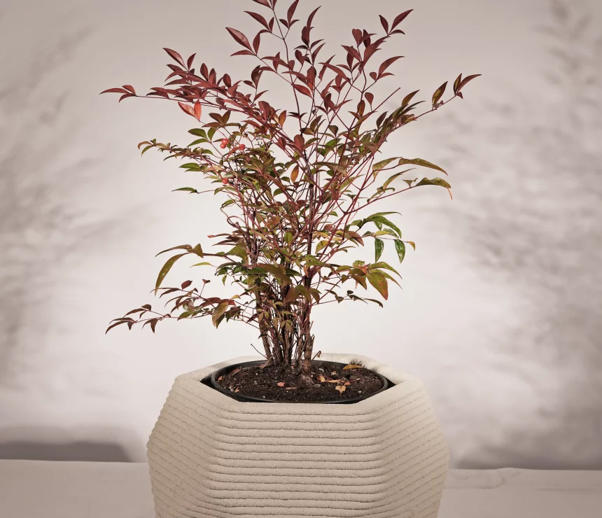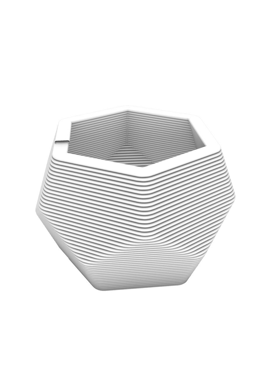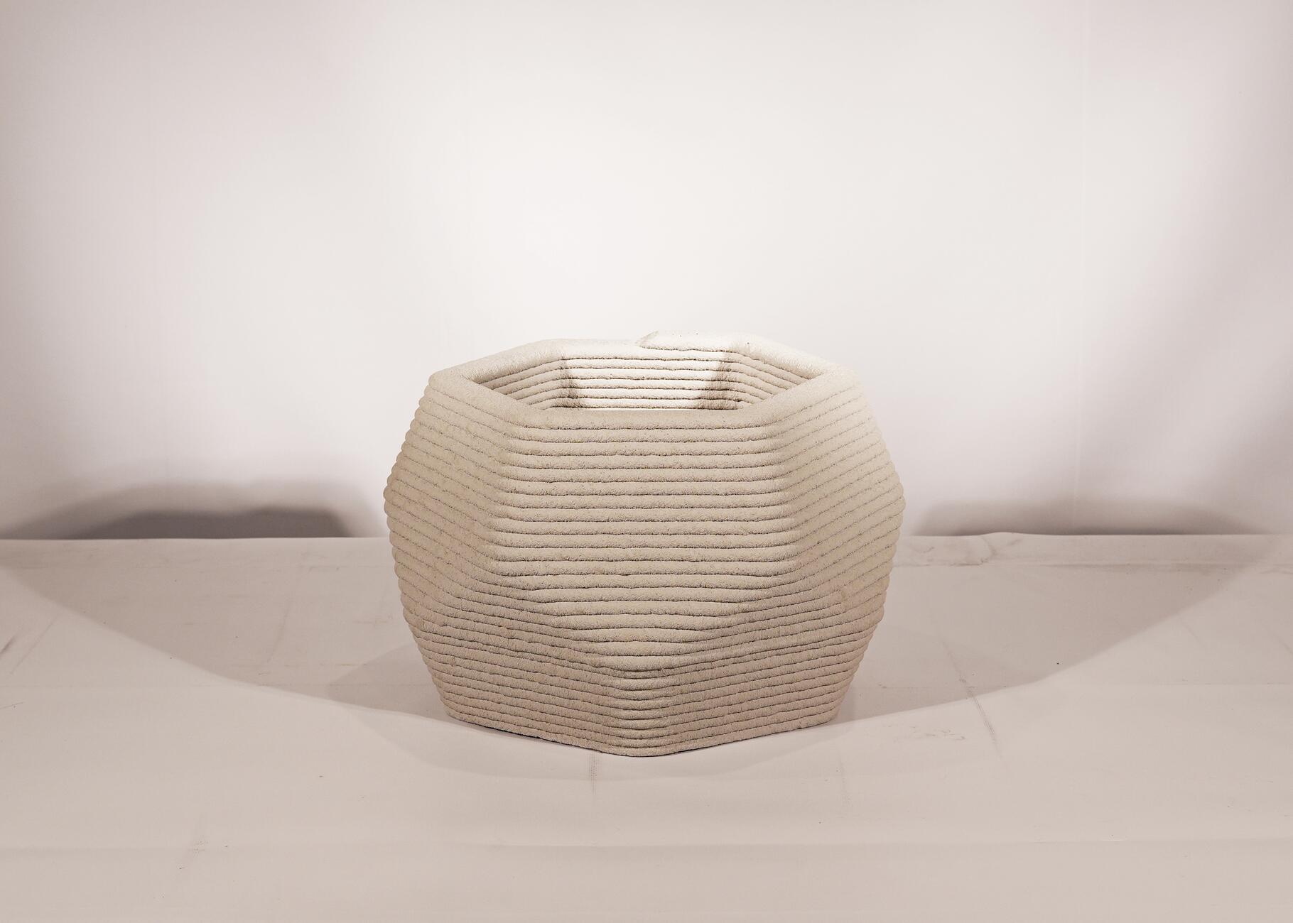 Velký geometrický betonový květináč, uzavřené dno a vnitřní plastová vložka s miskou. Zhotoveno z 3D tištěného betonu. Květináč je určen do exteriéru nebo interiéru.