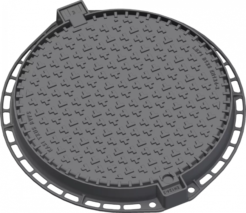 Poklop EUROPA 7 s pantem. DN 600. Zatížení B 125 - parkovací plochy pro osobní vozidla. Materiál: Litina. Hmotnost 33 kg. Norma EN124-2. Balení 20 ks/pal. Poklop s pantem, víko litina bez ventilace s otevřeným pantem, bez pružinového zajíštění víka v rámu, rám litina patkový v. 70 mm bez osazení pro lapač.