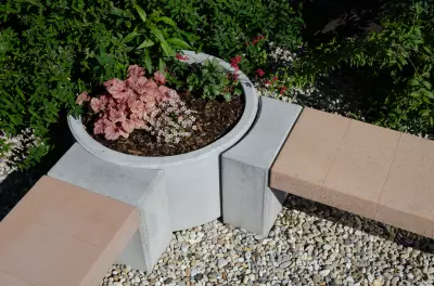 Sestava tří laviček MIAKI doplněná dvěma květináči MIA může vytvořit rovnou linii nebo díky přechodové noze zalomit posezení v libovolném úhlu.