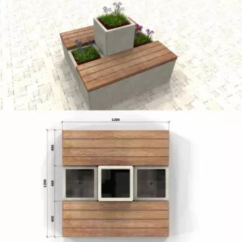 Dvě lavičky Sandra a tři květináče pro dvojúrovňové osázení rostlinami společně tvoří příjemné posezení ve čtvercovém půdorysu.